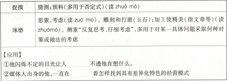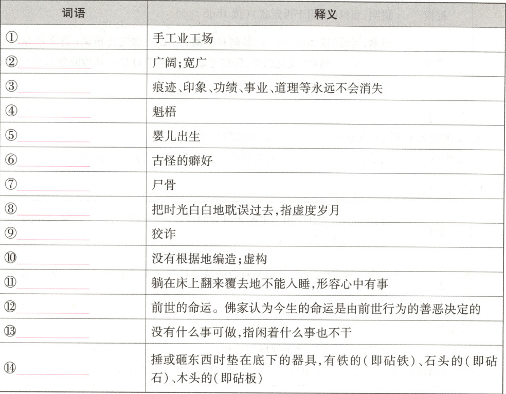 3. ①作坊(zuō fang) ②广袤(mào) ③不可磨灭 ④魁伟 ⑤呱呱(gū gū)坠地 ⑥怪癖(pǐ) ⑦骨殖(gǔ shi) ⑧岁月蹉跎(guō tuó) ⑨狡黠(xiá) ⑩杜撰 ⑪辗转反侧 ⑫宿(sù)命 ⑬无所事事 ⑭砧(zhēn)子
