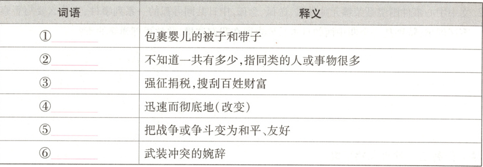 3. ①襁褓 ②不知凡几 ③横征暴敛 ④幡然 ⑤化干戈为玉帛 ⑥兵戎相见