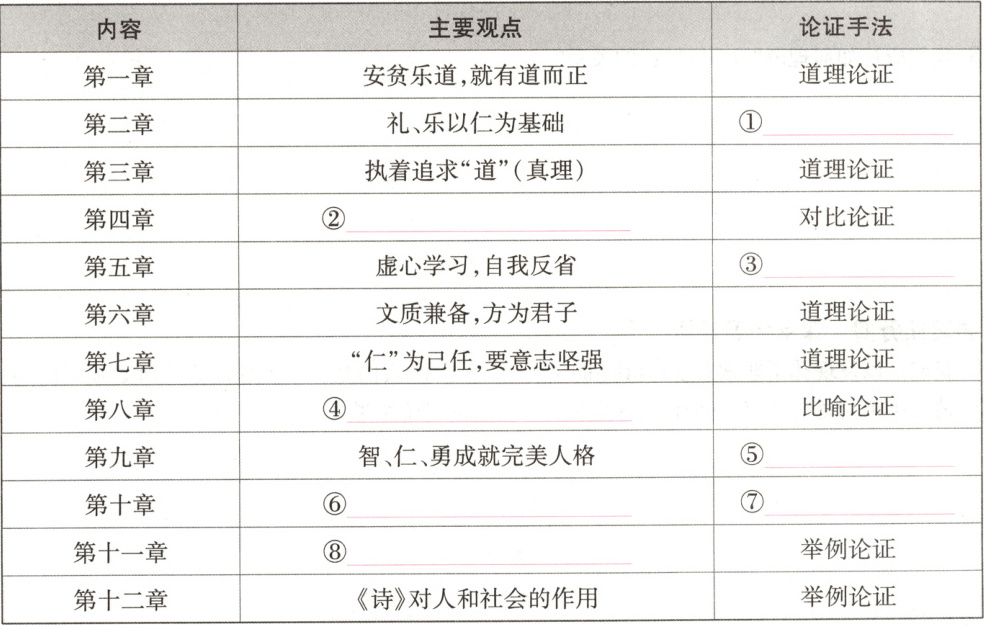 3. 《〈论语〉十二章》中每一章都分别阐释了什么观点?又分别运用了什么论证手法?请把答案填在下表中。