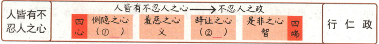 (1)“不忍人之心”:即为“恻隐之心”“羞恶之心”“辞让之心”“是非之心”,此“四心”是“仁、义、礼、智”这四种道德范畴的发端,或者说是“四端”。