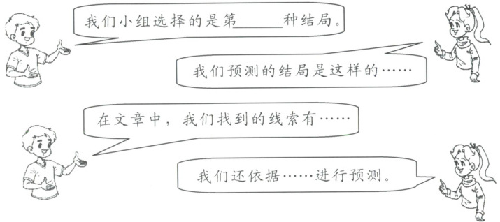 7. 一边读《小狗学叫》一边预测后面的内容,在文中找寻线索,想一想故事的结局可能是什么。小组讨论交流,选择三个结局中的一个进行预测,并说说这样预测的理由。
