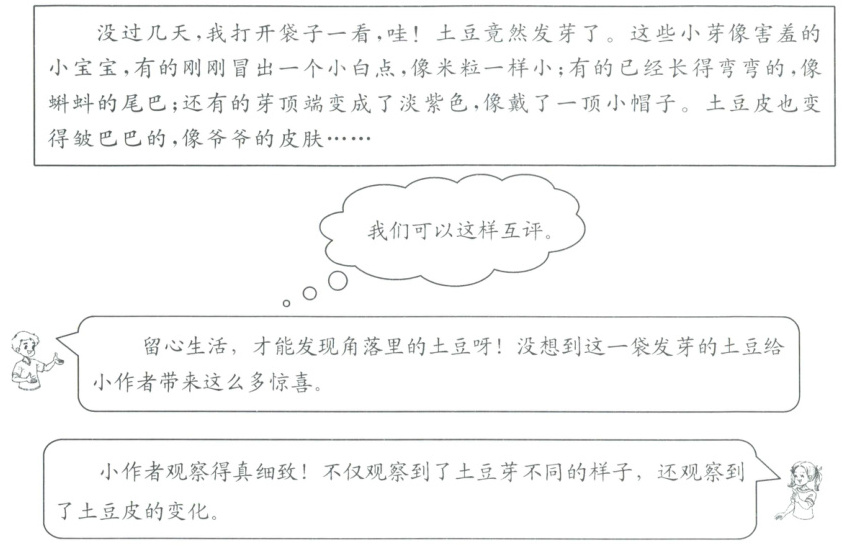 3. 文中比喻用得真生动!把小芽比作“害羞的小宝宝”“蝌蚪的尾巴”,让我们好像真的看到了发芽的土豆。
