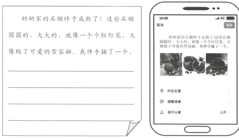 我用小刀轻轻切开它,哇!里面的石榴籽晶莹剔透,像一颗颗红宝石挤在一起。我拿起一颗放进嘴里,甜甜的汁水在舌尖散开,好吃极了!奶奶看着我吃得开心,脸上也露出了笑容。