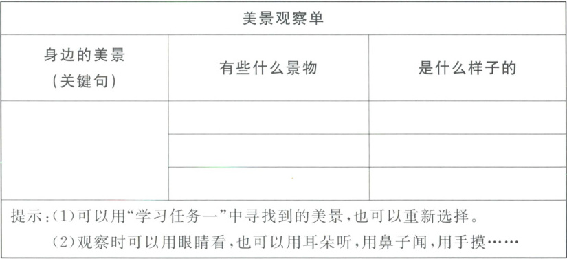 6. 借助“美景观察单”,说说自己寻找到的身边美景,和大家分享。