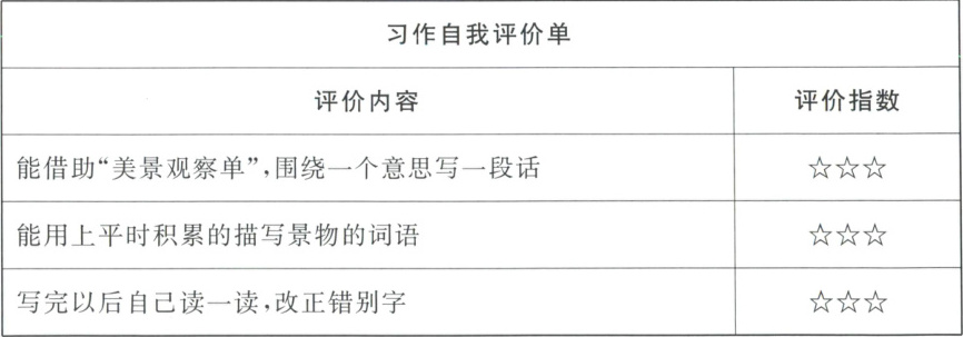 1. 能借助“美景观察单”,围绕一个意思写一段话:★★★