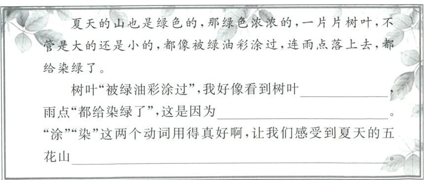 “涂”“染”这两个动词用得真好啊,让我们感受到夏天的五花山绿色浓浓的,生机勃勃。