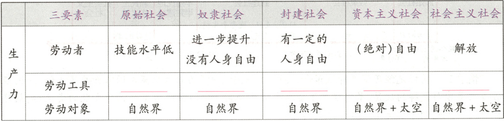 1. 填写上述表格并进行横向纵向对比,总结人类社会发展的基本规律。