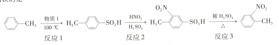 2.A 反应3为磺酸基—$\mathrm{HSO_3}$被H取代,属于取代反应,A项错误;对比反应1的反应物和反应3的产物可知,甲基对位的氢原子没有变化,故目的是在甲基邻位引入硝基并保护对位氢原子不被硝基取代,B项正确;$\mathrm{H_3C}$
