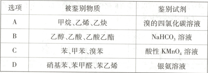2.A 乙烯、乙炔都能与溴的四氯化碳溶液发生加成反应使溶液褪色,则溴的四氯化碳溶液不能鉴别甲烷、乙烯、乙炔,故A错误;乙醇溶于水,向乙醇中分别加入碳酸氢钠溶液,溶液不会分层,乙酸乙酯不溶于水,向乙酸乙酯中加入碳酸氢钠溶液,溶液会分层,乙酸能与碳酸氢钠溶液反应生成二氧化碳气体,则碳酸氢钠溶液能用于鉴别乙醇、乙酸、乙酸乙酯,故B正确;苯不溶于水,密度比水小,向苯中加入酸性高锰酸钾溶液,溶液分层,有机层在上方,溴苯不溶于水,密度比水大,向溴苯中加入酸性高锰酸钾溶液,溶液分层,有机层在下方,甲苯能与酸性高锰酸钾溶液发生氧化反应使溶液褪色,则用酸性高锰酸钾溶液能鉴别苯、甲苯、溴苯,故C正确;硝基苯不溶于水,密度比水大,向硝基苯中加入银氨溶液,溶液分层,有机层在下方,苯乙烯不溶于水,密度比水小,向苯乙烯中加入银氨溶液,溶液分层,有机层在上方,苯甲醛能与银氨溶液共热发生银镜反应,所以银氨溶液能鉴别硝基苯、苯甲醛、苯乙烯,故D正确。