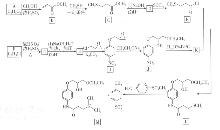 [解析]由流程图可知,A与甲醇发生酯化反应生成B,则A的结构简式为CH₂=CH—COOH;B与CH₃SH发生加成反应生成C;C在碱性条件下发生酯的水解反应,酸化后生成D,则D的结构简式为CH₃S—