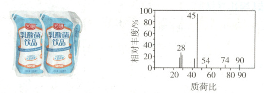 已知 $9.0 g$乳酸在足量 $O_2$中充分燃烧,将生成的混合气体依次通过足量的浓硫酸和碱石灰,分别增重 $5.4 g$和 $13.2 g$,经检验剩余气体为 $O_2$。乳酸分子的质谱图如图。