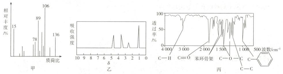 3. (2025·河北保定高二期中)将 $6.8 g$有机物 $X$完全燃烧可生成 $3.6 g H_2O$和 $8.96 L$(标准状况下)$CO_2$。$X$的质谱图、核磁共振氢谱图、红外光谱图分别如图甲、乙、丙所示,其分子中只含一个苯环且苯环上只有一个取代基。下列关于有机物 $X$的叙述不正确的是 (