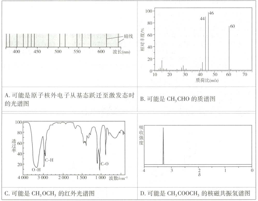 4.A 原子核外电子从基态跃迁至激发态时吸收能量,光谱图显示吸收的暗线,故 A 正确;质谱图中质荷比最大为相对分子质量,$\mathrm{CH_3CHO}$分子量为44,但质谱图显示质荷比最大为60,故 B 错误;红外光谱图显示化学键和官能团,红外光谱图显示有$\mathrm{O—H}$键,而$\mathrm{CH_3—O—CH_3}$没有$\mathrm{O—H}$键,故 C 错误;核磁共振氢谱显示等效氢原子,有几个峰就有几种等效氢原子,$\mathrm{CH_3COOCH_3}$有两种等效氢原子,而图中显示只有一个峰,故 D 错误。