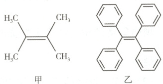 2.A 甲、乙分子中含有碳碳双键,但乙中含有苯环,甲中没有,所以甲、乙不是同系物,故A项错误;可看成乙烯中的氢原子均被苯基取代,具有乙烯的结构特点,所有碳原子可能处于同一平面上,故B项正确;由甲结构式可知,甲分子中含碳碳双键,能与溴的四氯化碳溶液发生加成反应使之褪色,也能与酸性 $\mathrm{KMnO}_{4}$ 溶液发生氧化反应使之褪色,原理不同,故C项正确;乙中四个苯环处在相同的化学环境,其一氯代物在苯环上有邻位、对位、间位3种,故D项正确。