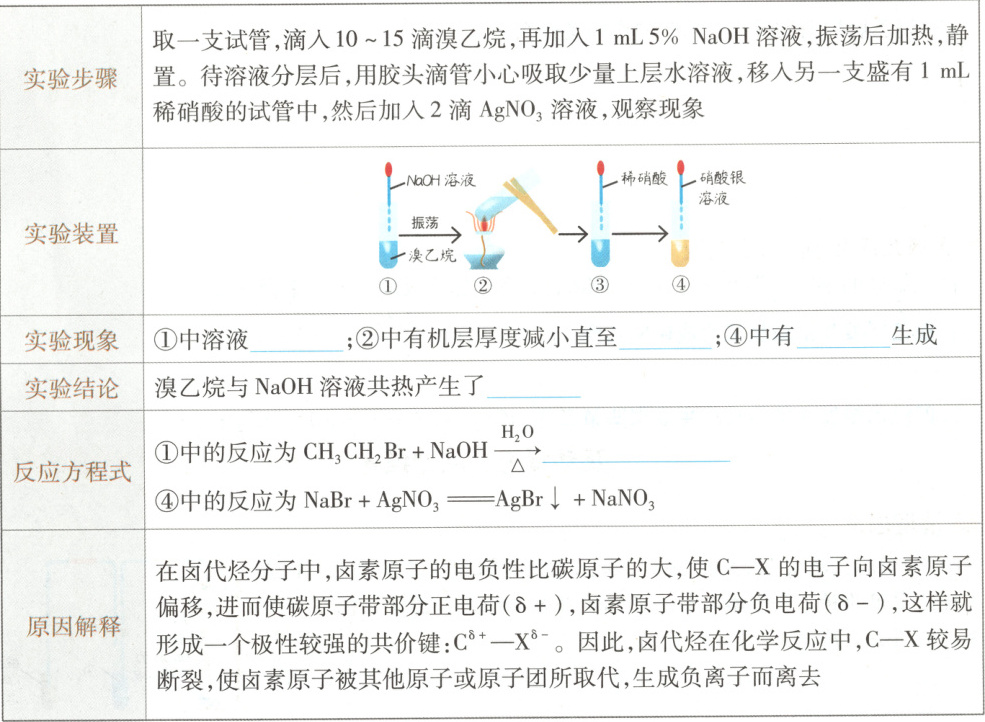 一、分层 消失 淡黄色沉淀 $\mathrm{Br^-}$ $\mathrm{CH_3CH_2OH+NaBr}$