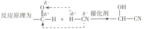 ${CH3 -C^{||} -H + H -CN \xrightarrow{催化剂} CH3 -CH -CN}$ $\quad \quad \quad \quad \quad OH$