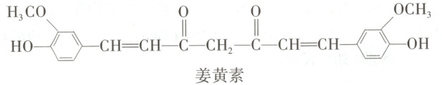3.B 由结构简式可知,姜黄素的分子式为$C_{21}H_{20}O_6$,故A错误;由结构简式可知,姜黄素分子中含有酚羟基,能与溴水发生取代反应,含有的苯环、酮羰基和碳碳双键能发生加成反应,故B正确;由结构简式可知,姜黄素分子中的含氧官能团为羟基、醚键、羰基,共$3$种,故C错误;酮羰基不能被银氨溶液或新制的氢氧化铜等弱氧化剂氧化,故D错误。