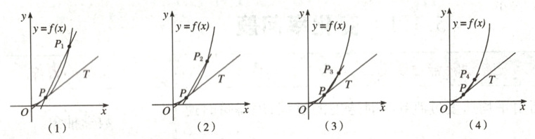 如图所示,当曲线$y = f(x)$上的动点$P_n(x_n,f(x_n))$沿着曲线无限接近定点$P(x_0,f(x_0))$时,割线$PP_n$无限趋近于一个确定的位置,这个确定位置的直线$PT$称为曲线在点$P$处的切线.(1)(2)(3)(4)