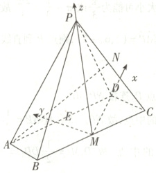 取$AD$中点$E$,连接$ME$,则$ME$,$DM$,$PM$两两垂直,以点$M$为坐标原点,如图所示,建立空间直角坐标系。