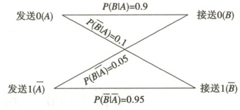 由题意得$P(A)=P(\overline{A})=0.5,P(B|A)=0.9,P(B|\overline{A})=0.1$,$P(\overline{B}|A)=0.05,P(\overline{B}|\overline{A})=0.95$。