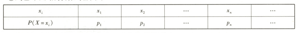 若离散型随机变量 $X$ 的取值为 $x_{1},x_{2},·s,x_{n},·s$, 随机变量 $X$ 取 $x_{i}$ 的概率为 $p_{i}(i=1,2,·s,n,·s)$ 记作 $P(X=x_{i})=p_{i}(i=1,2,·s,n,·s)$①