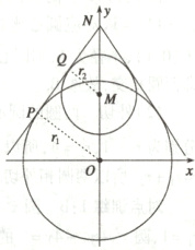 解法三:两圆的连心线方程为$x = 0$(即$y$轴),设两圆的连心线与其公切线交于点$N$,如图所示