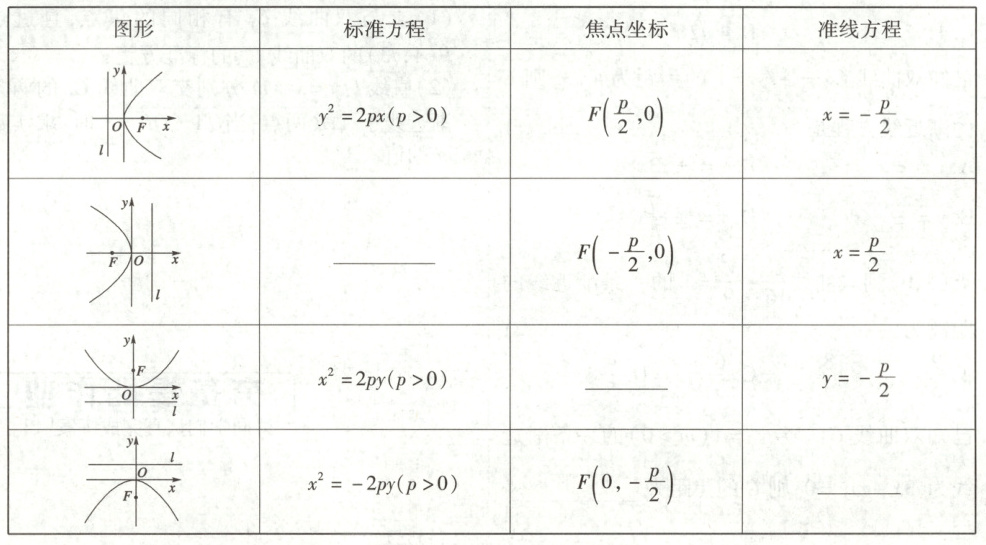 抛物线的标准方程有四种形式:$y^{2}=2px$,$y^{2} = - 2px$,$x^{2}=2py$,$x^{2} = - 2py$,标准方程中只含一个参数$p(p > 0)$,参数$p$的几何意义是焦点到准线的距离,所以$p$恒为正. 抛物线的标准方程及相应的焦点坐标、准线方程.