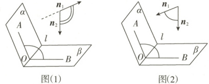 一般地,已知$\boldsymbol{n_1}$,$\boldsymbol{n_2}$分别为平面$\alpha$,$\beta$的法向量,则二面角$\alpha - l - \beta$的平面角与两法向量所成角$\langle\boldsymbol{n_1},\boldsymbol{n_2}\rangle$(如图(1))或(如图(2)).