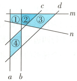 3. 如图,直线$a$、$b$互相平行,直线$c$、$d$互相平行,直线$m$、$n$不平行。涂色部分中,(