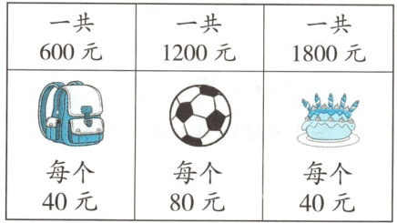 答:600元能买15个书包,1200元能买15个足球,1800元能买45个蛋糕。