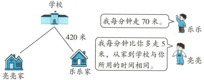 1. 乐乐的速度为每分钟70米,亮亮的速度为每分钟$70 + 5 = 75$(米)。