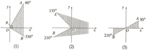(3)$30° = \frac{\pi}{6}$,$210° = \frac{7\pi}{6}$,所表示的区域由两部分组成,即终边落在阴影部分的角的集合为$\{\theta \mid 2k\pi < \theta < 2k\pi + \frac{\pi}{6}$, $k \in \mathbf{Z}\} \cup\{\theta \mid 2k\pi + \pi < \theta < 2k\pi + \frac{7\pi}{6}$, $k \in \mathbf{Z}\} = \{\theta \mid 2k\pi < \theta < 2k\pi + \frac{\pi}{6}$, $k \in \mathbf{Z}\} \cup\{\theta \mid (2k + 1)\pi < \theta < (2k + 1)\pi + \frac{\pi}{6}$, $k \in \mathbf{Z}\} = \{\theta \mid n\pi < \theta <n\pi + \frac{\pi}{6}$,