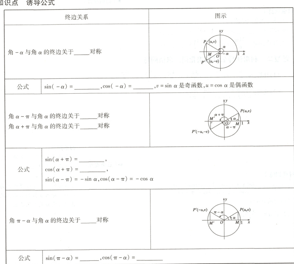 角$\alpha + \pi$与角$\alpha$的终边关于原点对称,公式$\sin(\alpha + \pi)=-\sin \alpha$,$\cos(\alpha + \pi)=-\cos \alpha$;角$\pi - \alpha$与角$\alpha$的终边关于y轴对称,公式$\sin(\pi - \alpha)=\sin \alpha$,$\cos(\pi - \alpha)=-\cos \alpha$