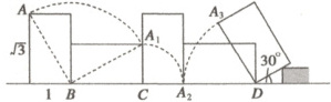 6.如图所示,已知一长为$\sqrt{3} dm$,宽为$1 dm$的长方形木块在桌面上做无滑动的翻滚,翻滚到第四次时被一小木板挡住,使木块底面与桌面成$30^{\circ}$的角,则点$A$走过的路程是