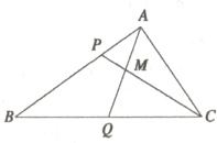 $\therefore$设$\overrightarrow{CM}=x\overrightarrow{CQ}+(1 - x)\overrightarrow{CA}=\frac{x}{2}\overrightarrow{CB}+(x - 1)\overrightarrow{AC}$,又$\overrightarrow{CB}=\overrightarrow{AB}-\overrightarrow{AC}$,$\therefore\overrightarrow{CM}=\frac{x}{2}\overrightarrow{AB}+(\frac{x}{2}-1)\overrightarrow{AC}$.