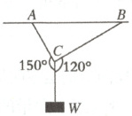 如图,用两根绳子把重$10\ N$的物体$W$吊在水平杆子$AB$上,$\angle ACW = 150^{\circ}$,$\angle BCW = 120^{\circ}$,求$A$和$B$处所受力的大小(绳子的重量忽略不计).