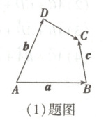 例1.(1)如图,四边形$ABCD$中,若$\overrightarrow{AB} = \boldsymbol{a},\overrightarrow{AD} = \boldsymbol{b},\overrightarrow{BC} = \boldsymbol{c}$,则$\overrightarrow{DC} =$ (