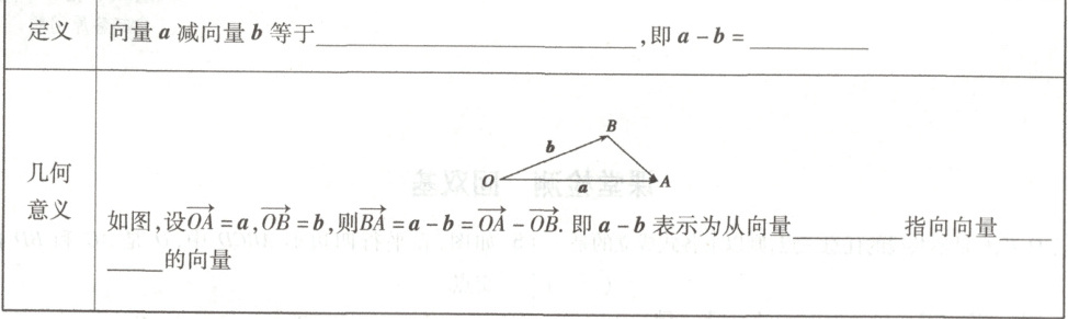 如图,设$\overrightarrow{OA} = \boldsymbol{a},\overrightarrow{OB} = \boldsymbol{b}$,则$\overrightarrow{BA} = \boldsymbol{a}-\boldsymbol{b} = \overrightarrow{OA}-\overrightarrow{OB}$.即$\boldsymbol{a}-\boldsymbol{b}$表示为从向量$\boldsymbol{b}$指向向量$\boldsymbol{a}$的向量