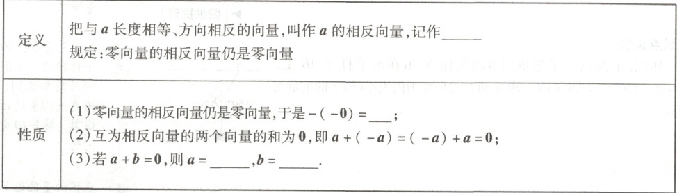 (3)若$\boldsymbol{a}+\boldsymbol{b} = 0$,则$\boldsymbol{a} = -$$\boldsymbol{b}$,$\boldsymbol{b} =$$- \boldsymbol{a}$.
