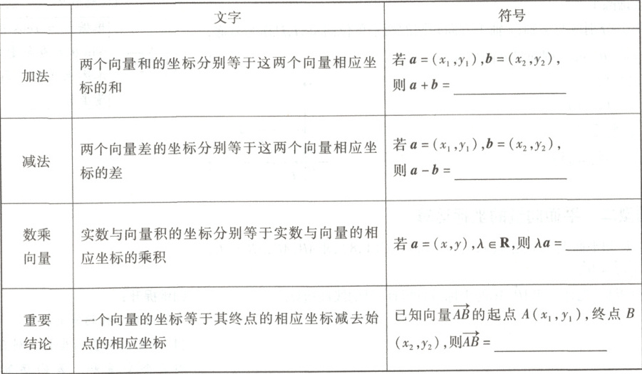 $(x_1 + x_2,y_1 + y_2)$;$(x_1 - x_2,y_1 - y_2)$;$(\lambda x,\lambda y)$;$(x_2 - x_1,y_2 - y_1)$。