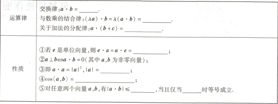 1. 定义:已知两个非零向量$\boldsymbol{a}$和$\boldsymbol{b}$,它们的夹角$\langle\boldsymbol{a},\boldsymbol{b}\rangle = \theta$,把$|\boldsymbol{a}||\boldsymbol{b}|\cos\langle\boldsymbol{a},\boldsymbol{b}\rangle$称为向量$\boldsymbol{a}$与$\boldsymbol{b}$的数量积(或内积),记作$\boldsymbol{a} · \boldsymbol{b}$,即$\boldsymbol{a} · \boldsymbol{b} = \underline{ \underline{|\boldsymbol{a}||\boldsymbol{b}|\cos\theta}}$