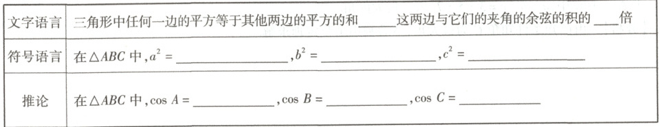 知识点1 减去 $a^{2}+b^{2}-2ab\cos C$ $\frac{b^{2}+c^{2}-2b c \cos A}{2 b c}$ $\frac{c^{2}+a^{2}-2c a \cos B}{2 a c}$ $\frac{a^{2}+b^{2}-c^{2}}{2 a b}$