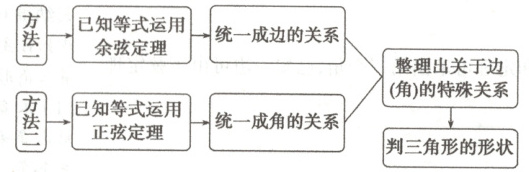 例 3:方法一:(角化边)因为$(a - c·\cos B)·\sin B=(b - c·\cos A)·\sin A$, 所以$(a - c·\frac {a^{2}+c^{2}-b^{2}}{2ac})· b=(b - c·\frac {b^{2}+c^{2}-a^{2}}{2bc})· a$, 整理得:$b^{2}(a^{2}-c^{2}+b^{2})=a^{2}(b^{2}-c^{2}+a^{2})$, 即$(a^{2}-b^{2})(a^{2}+b^{2}-c^{2})=0$, 所以$a^{2}+b^{2}-c^{2}=0$或$a^{2}=b^{2}$. 所以$a^{2}+b^{2}=c^{2}$或$a=b$. 故$\triangle ABC$为直角三角形或等腰三角形. 方法二:(边化角)根据正弦定理,原等式可化为: $(\sin A - \sin C\cos B)\sin B=(\sin B - \sin C\cos A)\sin A$, 即$\sin C\cos B\sin B=\sin C\cos A\sin A$. 因为$\sin C\neq0$,所以$\sin B\cos B=\sin A\cos A$. 所以$\sin2B=\sin2A$.所以$2B=2A$或$2B + 2A=\pi$, 即$A=B$或$A + B=\frac {\pi}{2}$. 所以$\triangle ABC$是等腰三角形或直角三角形. 对点训练 3:方法一:根据正弦定理,得$\frac {a}{\sin A}$=$\frac {b}{\sin B}$=$\frac {c}{\sin C}$ $\because\sin^{2}A=\sin^{2}B+\sin^{2}C$,$\therefore a^{2}=b^{2}+c^{2}$, $\therefore A$是直角,$B + C=90^{\circ}$, $\therefore2\sin B\cos C=2\sin B\cos(90^{\circ}-B)$ $=2\sin^{2}B=\sin A = 1$, $\therefore\sin B=\frac {\sqrt {2}}{2}$. $\because0^{\circ}<B<90^{\circ}$,$\therefore B = 45^{\circ}$,$C = 45^{\circ}$, $\therefore\triangle ABC$是等腰直角三角形. 方法二:根据正弦定理,得$\frac {a}{\sin A}$=$\frac {b}{\sin B}$=$\frac {c}{\sin C}$ $\because\sin^{2}A=\sin^{2}B+\sin^{2}C$, $\therefore a^{2}=b^{2}+c^{2}$,$\therefore A$是直角, $\because A=180^{\circ}-(B + C)$,$\sin A=2\sin B\cos C$, $\therefore\sin(B + C)=\sin B\cos C+\cos B\sin C=2\sin B\cos C$, $\therefore\sin(B - C)=0$. 又$-90^{\circ}<B - C<90^{\circ}$,$\therefore B - C=0$,$\therefore B = C$, $\therefore\triangle ABC$是等腰直角三角形.