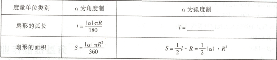 | 扇形的弧长 |$ l = \frac{|\alpha|\pi R}{180} $ |$ l = |\alpha| R $ |