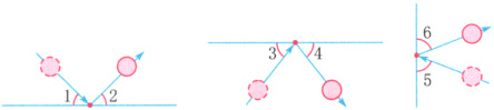 (1)$\angle1 = \angle2$,$\angle3 = \angle4$,$\angle5 = \angle6$,桌球射入路线与桌边的夹角和弹出路线与桌边的夹角相等