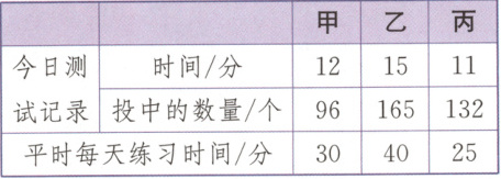 (1)可知3人平均每分投中的数量,再乘3人平时每天练习的时间即可得出3人平时每天练习投中的数量,最后进行比较。