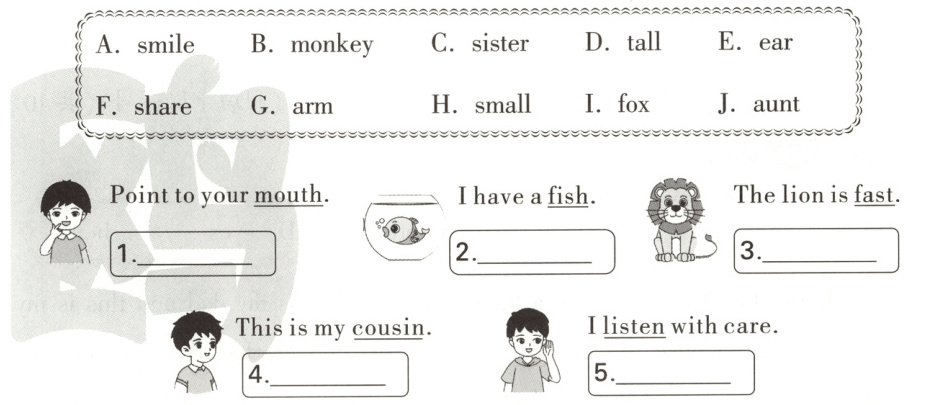 六、同学们来到动物园的“儿童体验区”参观。请你选出与同学们交流中的画线单词同类的单词。(只填字母标号)(共5分)