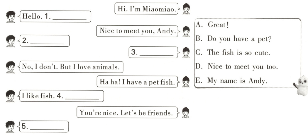 1. E 【解析】根据上句“Hi. I’m Miaomiao.”可知,此处应回应对方的自我介绍。结合备选项可知,E项“我的名字叫Andy。”符合语境。