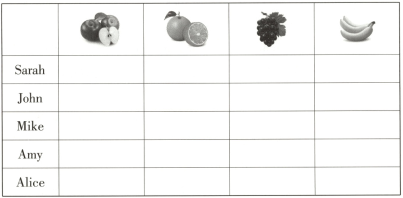 三、奇奇想在小报上设置水果喜好调查表。听大家的交流,帮助奇奇完成表格,在相应的水果下方画“ √ ”。每小题读两遍。( 共 10 分)