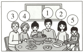 四、✨新题型 人物排序 去年中秋节聚餐的照片吸引了大家。听妙妙的介绍,根据听到的内容用1~5给人物进行标号。短文读三遍。(共10分)
